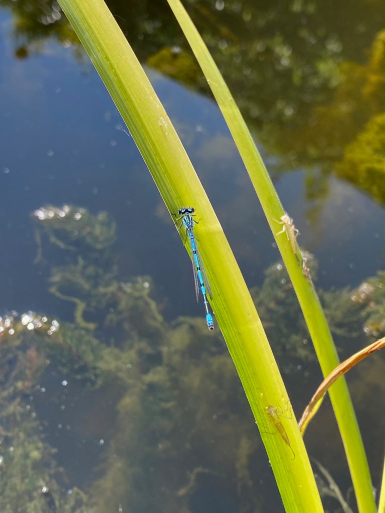 Every summer about a hundred damselflies frolic around the pond in our garden. Blue, green, red and brown. The different alternation of black rings on their abdomen looks like a bar code.